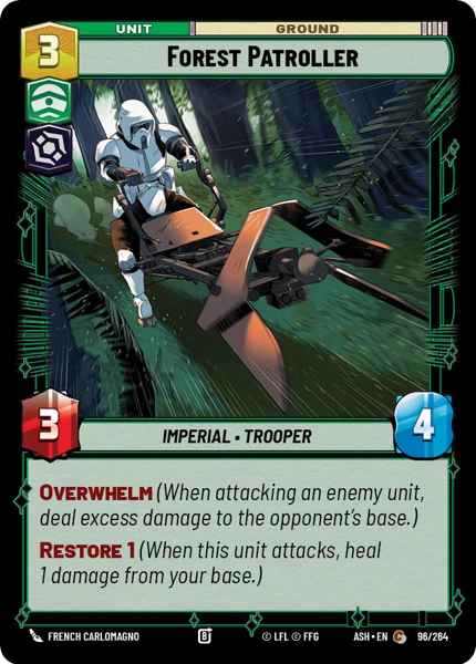 Overwhelm (When attacking an enemy unit, deal excess damage to the opponent's base.) Restore 1 (When this unit attacks, heal 1 damage from your base.)