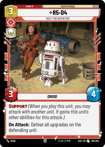 Support (When you play this unit, you may attack with another unit. It gains this unit's other abilities for this attack.) On Attack: Defeat all upgrades on the defending unit.