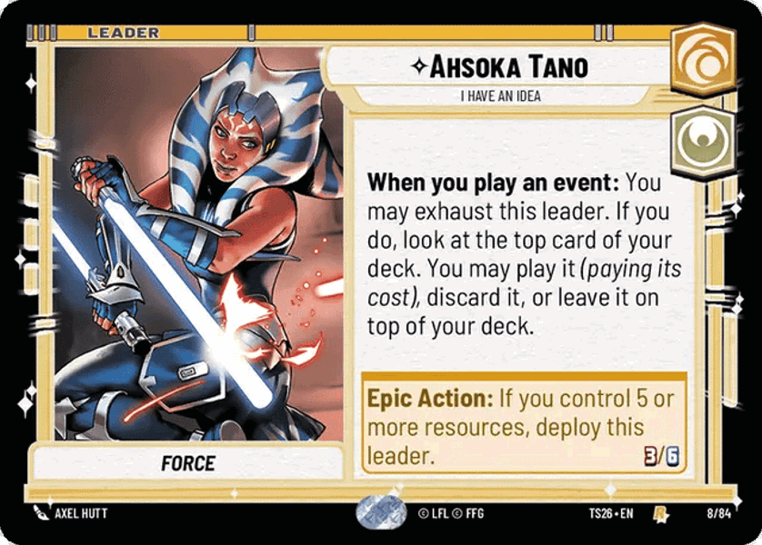 Hero Ability: When you play an event: You may exhaust this leader. If you do, look at the top card of your deck. You may play it (paying its cost), discard it, or leave it on top of your deck.