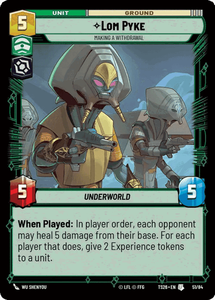 When Played: In player order, each opponent may heal 5 damage from their base. For each player that does, give 2 Experience tokens to a unit.