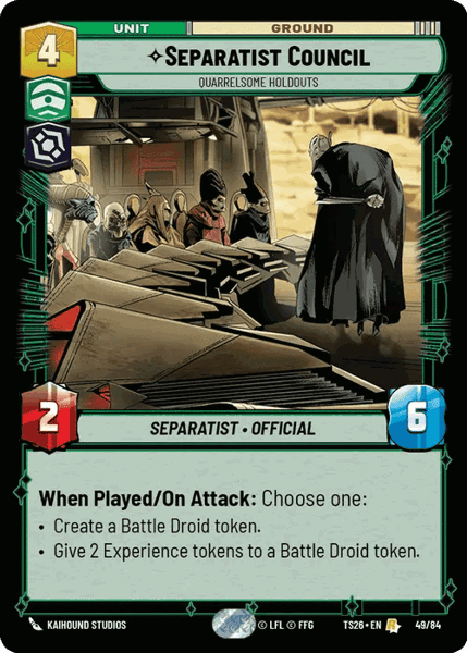 When Played/On Attack: Choose one: - Create a Battle Droid token. - Give 2 Experience tokens to a Battle Droid token.