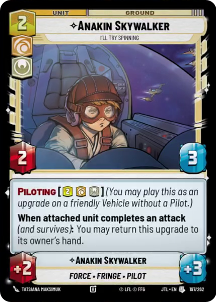 Piloting [2, [cunning], [heroism]](You may play this as an upgrade on a friendly Vehicle without a Pilot.)