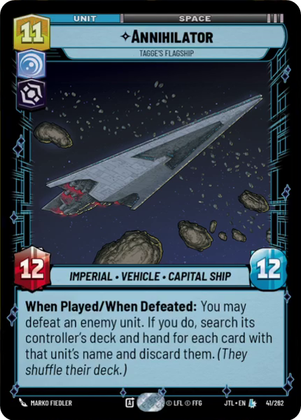 When Played/When Defeated: You may defeat an enemy unit. If you do, search its controller's deck and hand for each card with that unit's name and discard them. (They shuffle their deck.)