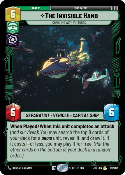 When Played/When this unit completes an attack (and survives): You may search the top 8 cards of your deck for a Droid unit, reveal it, and draw it. If it costs 2 or less, you may play it for free. (Put the other cards on the bottom of your deck in a random order.)