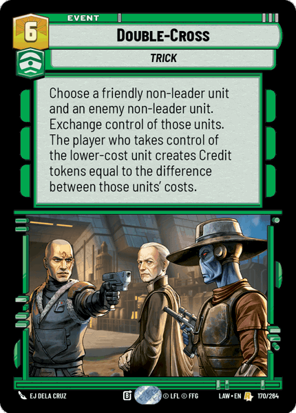 Choose a friendly non-leader unit and an enemy non-leader unit. Exchange control of those units. The player who takes control of the lower-cost unit creates Credit tokens equal to the difference between those units' costs.
