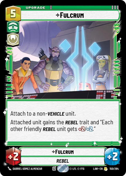 Attach to a non-Vehicle unit. Attached unit gains the Rebel trait and "Each other friendly REBEL unit gets +2/+2."