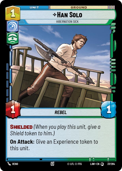 Shielded (When you play this unit, give a Shield token to him.) On Attack: Give an Experience token to this unit.
