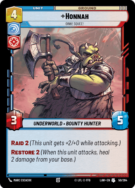 Raid 2 (This unit gets +2/+0 while attacking.) Restore 2 (When this unit attacks, heal 2 damage from your base.)