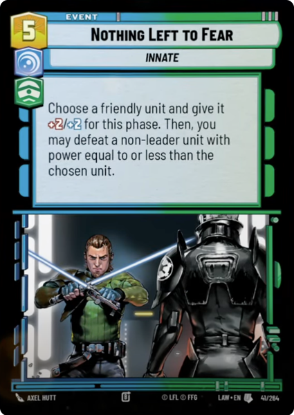 Choose a friendly unit and give it +2/+2 for this phase. Then, you may defeat a non-leader unit with power equal to or less than the chosen unit.