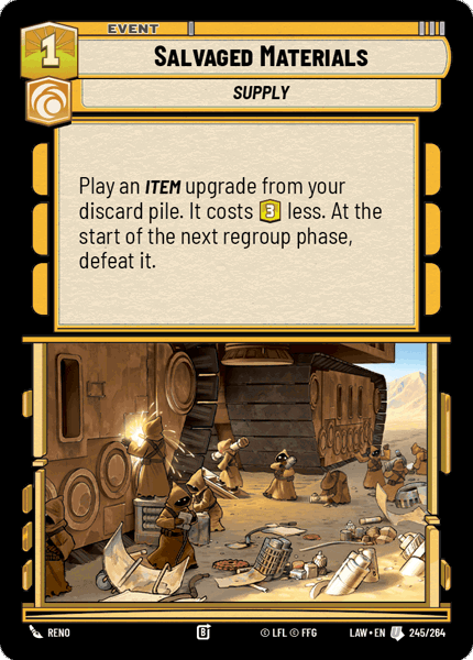 Play an Item upgrade from your discard pile. It costs 3 less. At the start of the next regroup phase, defeat it.