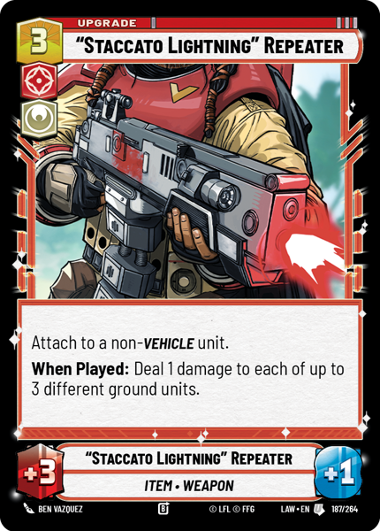 Attach to a non-Vehicle unit. When Played: Deal 1 damage to each of up to 3 different ground units.