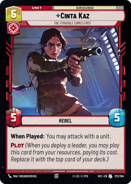 When Played: You may attack with a unit. Plot (When you deploy a leader, you may play this card from your resources, paying its cost. Replace it with the top card of your deck.)