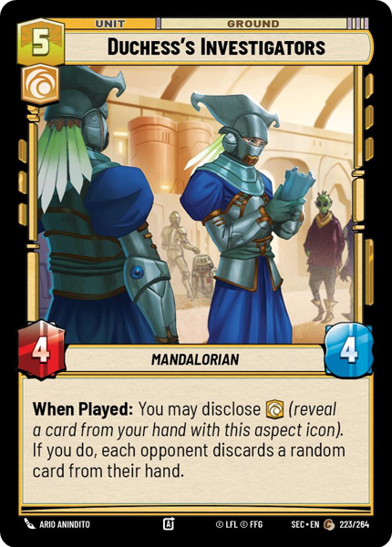 When Played: You may disclose [cunning] (reveal a card from your hand with this aspect icon). If you do, each opponent discards a random card from their hand.