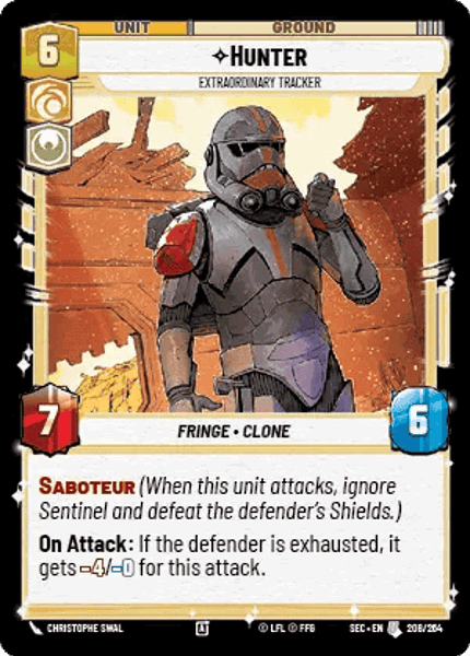 SABOTEUR (When this unit attacks, ignore Sentinel and defeat the defender's Shields.) On Attack: If the defender is exhausted, it gets -4/-0 for this attack.