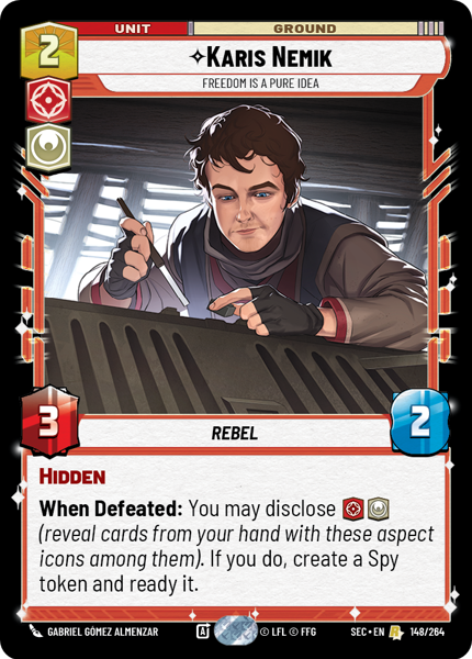 Hidden When Defeated: You may disclose [aggression] [heroism] (reveal cards from your hand with these aspect icons among them). If you do, create a Spy token and ready it.
