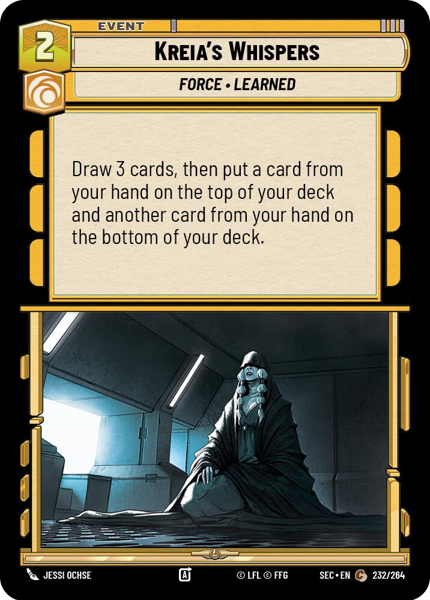 Draw 3 cards, then put a card from your hand on the top of your deck and another card from your hand on the bottom of your deck.