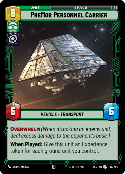 Overwhelm (When attacking an enemy unit, deal excess damage to the opponent's base.) When Played: Give this unit an Experience token for each ground unit you control.