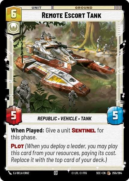 When Played: Give a unit Sentinel for this phase. Plot (When you deploy a leader, you may play this card from your resources, paying its cost. Replace it with the top card of your deck.)