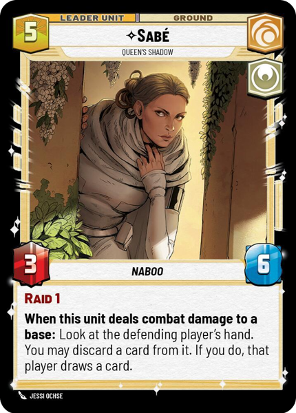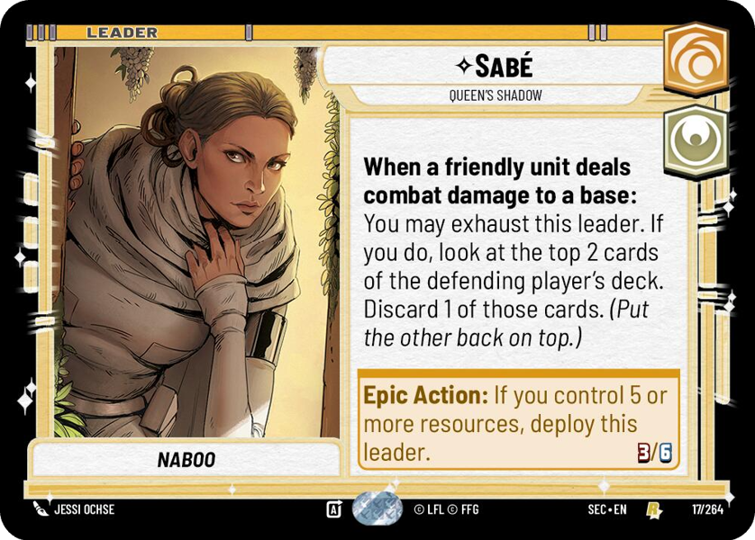 Hero Ability: When a friendly unit deals combat damage to a base: You may exhaust this leader. If you do, look at the top 2 cards of the defending player's deck. Discord 1 of those cards. (Put the other back on top.)