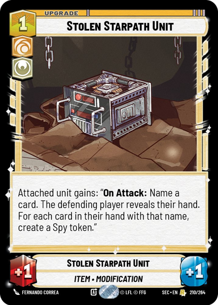 Attached unit gains: On Attack: Name a card. The defending player reveals their hand. For each card in their hand with that name, create a Spy token.