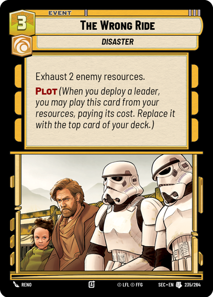 Exhaust 2 enemy resources. Plot (When you deploy a leader, you may play this card from your resources, paying its cost. Replace it with the top card of your deck.)